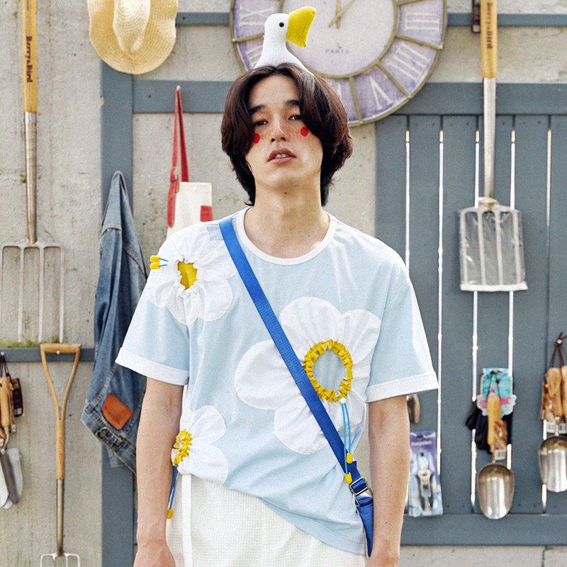 白花朵 时尚天空蓝潮流抽绳褶皱花卉短袖宽松T恤 设计师原创男装热门设计联盟服务商