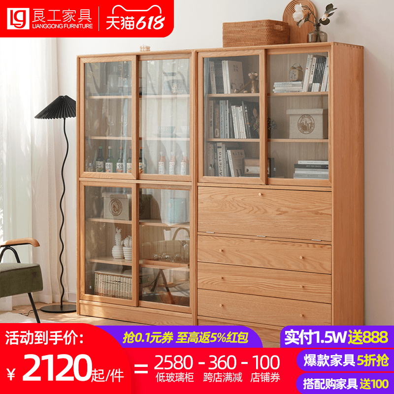 北欧实木书柜移门橡木器物柜餐边柜推拉门玻璃组合柜手办展示柜热门设计联盟服务商