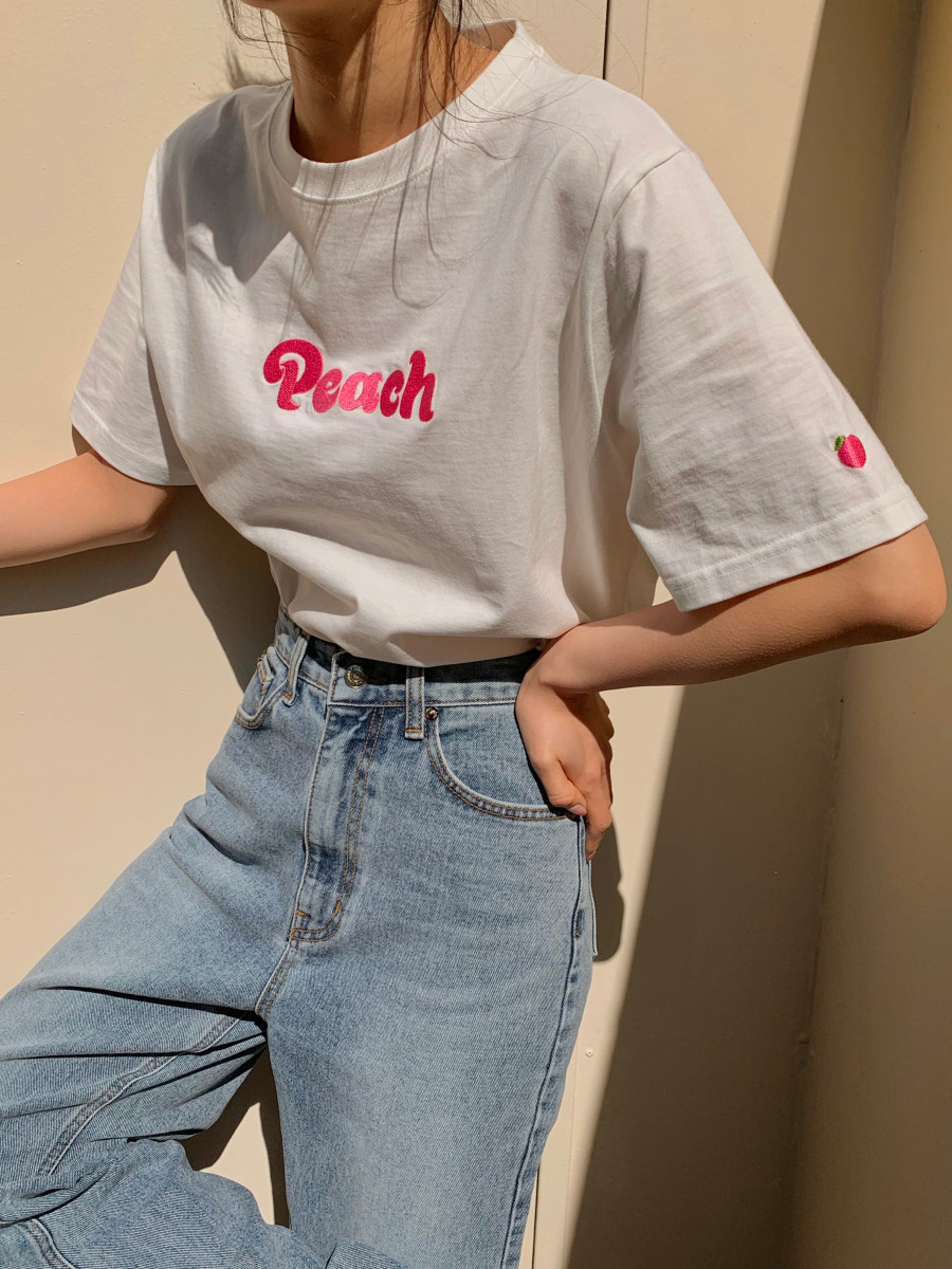 韩国小众设计师品牌法式复古peach刺绣T恤宽松短袖T恤女noirnine热门设计联盟服务商
